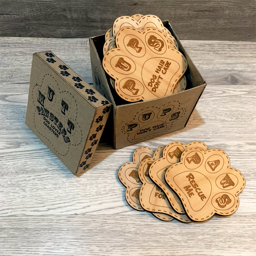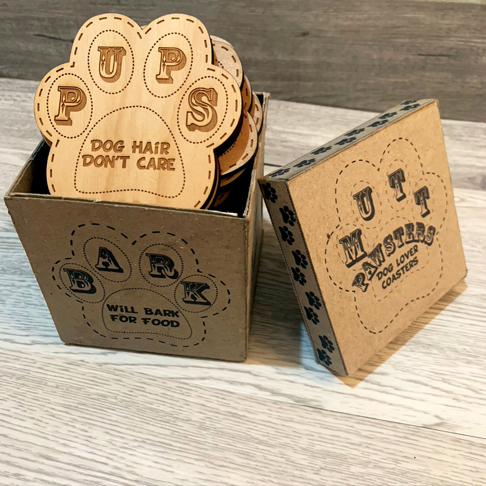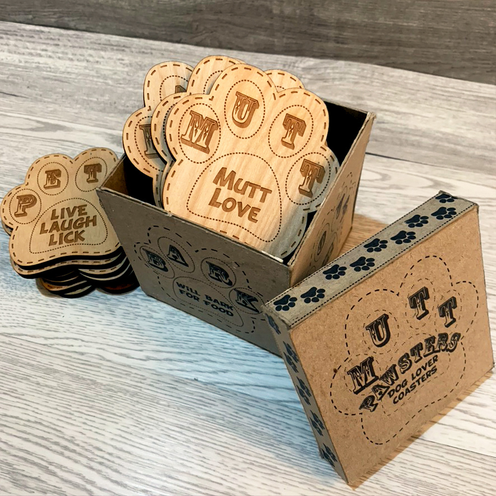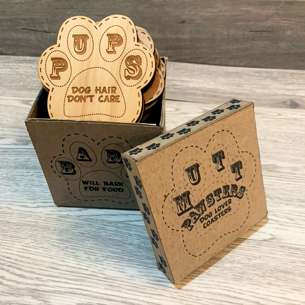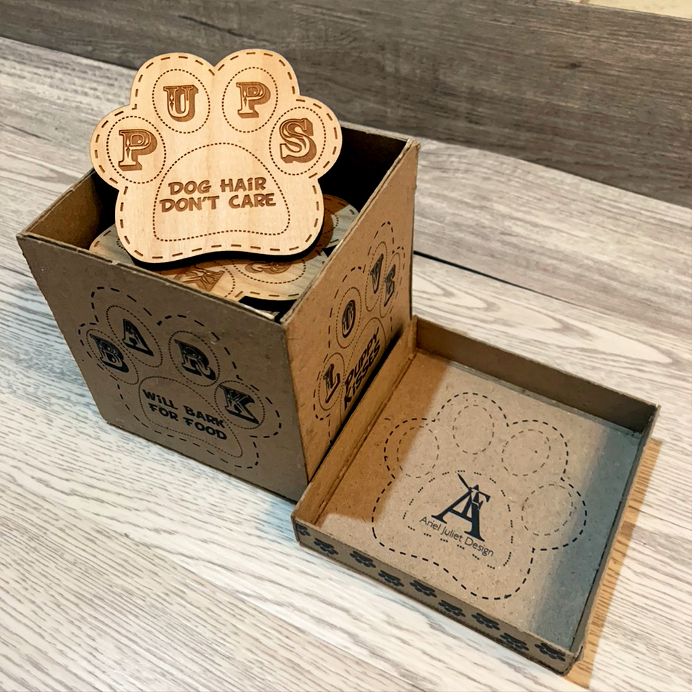 Laser cut coaster designs and handmade packaging design.